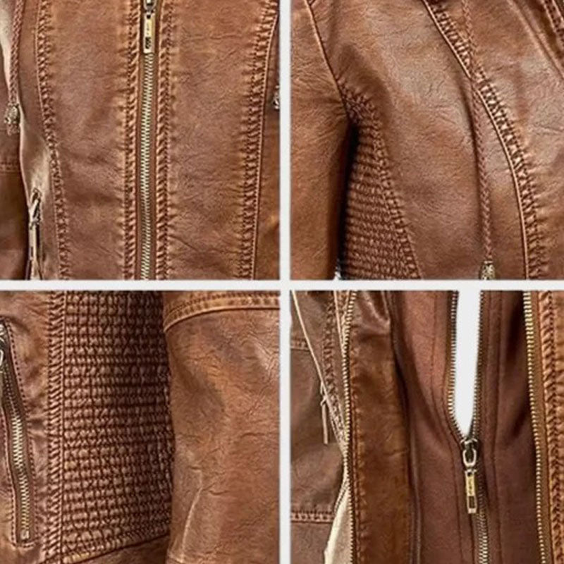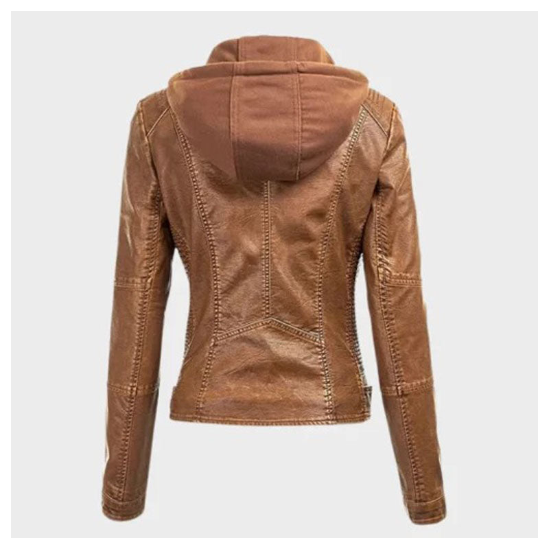 Women Removable Brown Leather Hooded Jacket